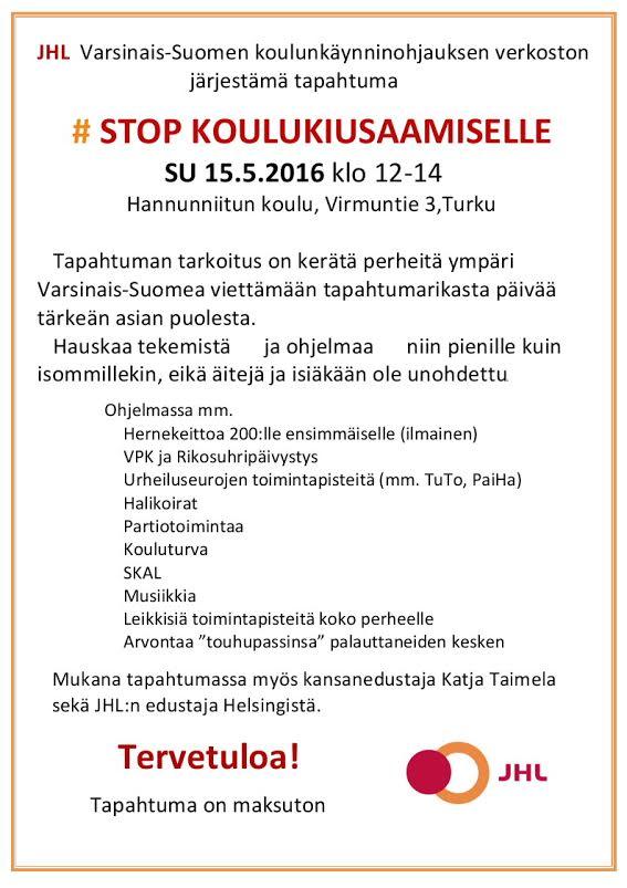 KOULUNKÄYNNIN ja AP-/IP-TOIMINNAN OHJAUKSEN AMMATILLINEN VERKOSTOn järjestämä tilaisuus #STOP KOULUKIUSAAMISELLE-tapahtuma Hannunniitun kentällä 15.5 2016 klo 12-14