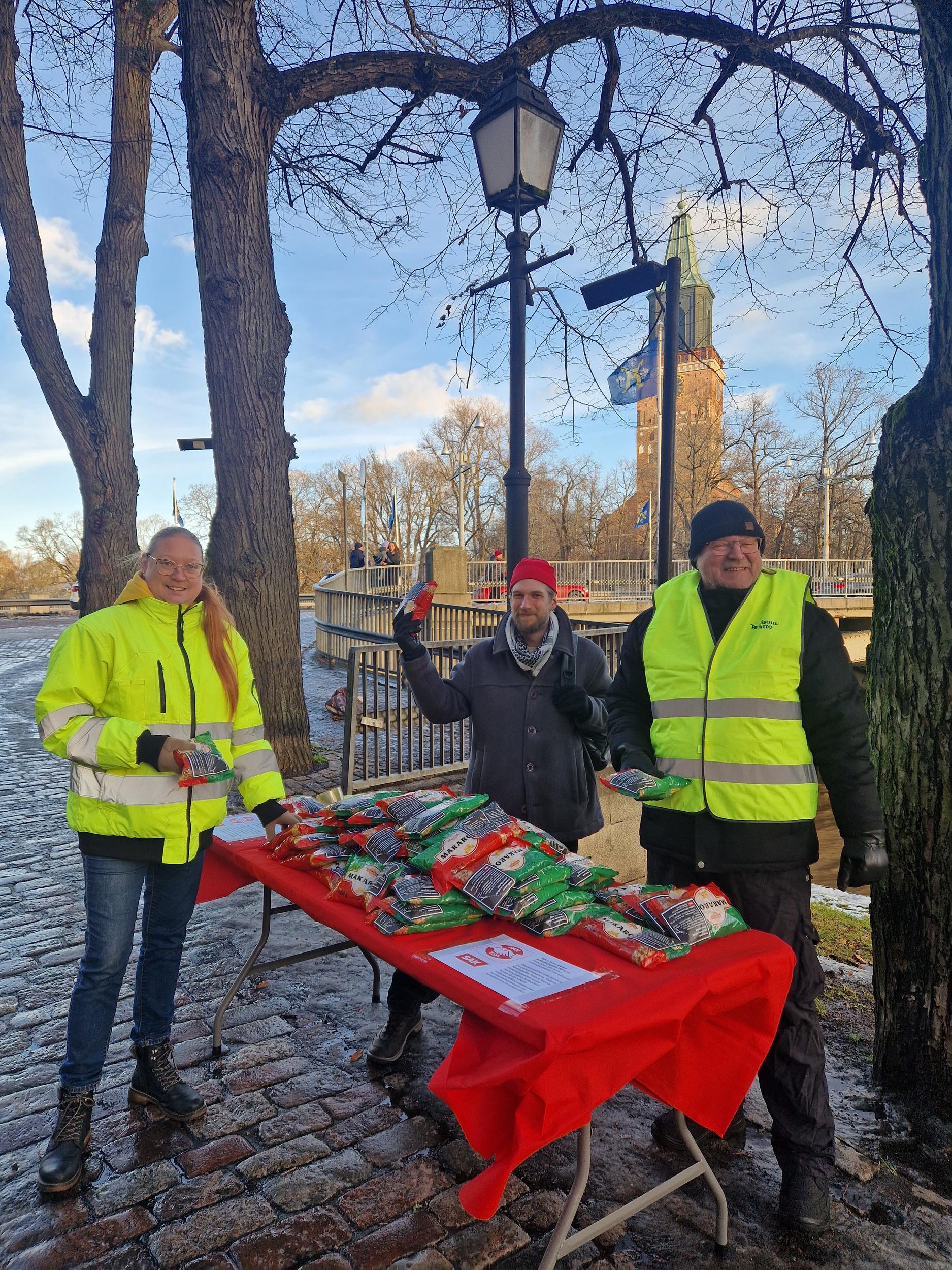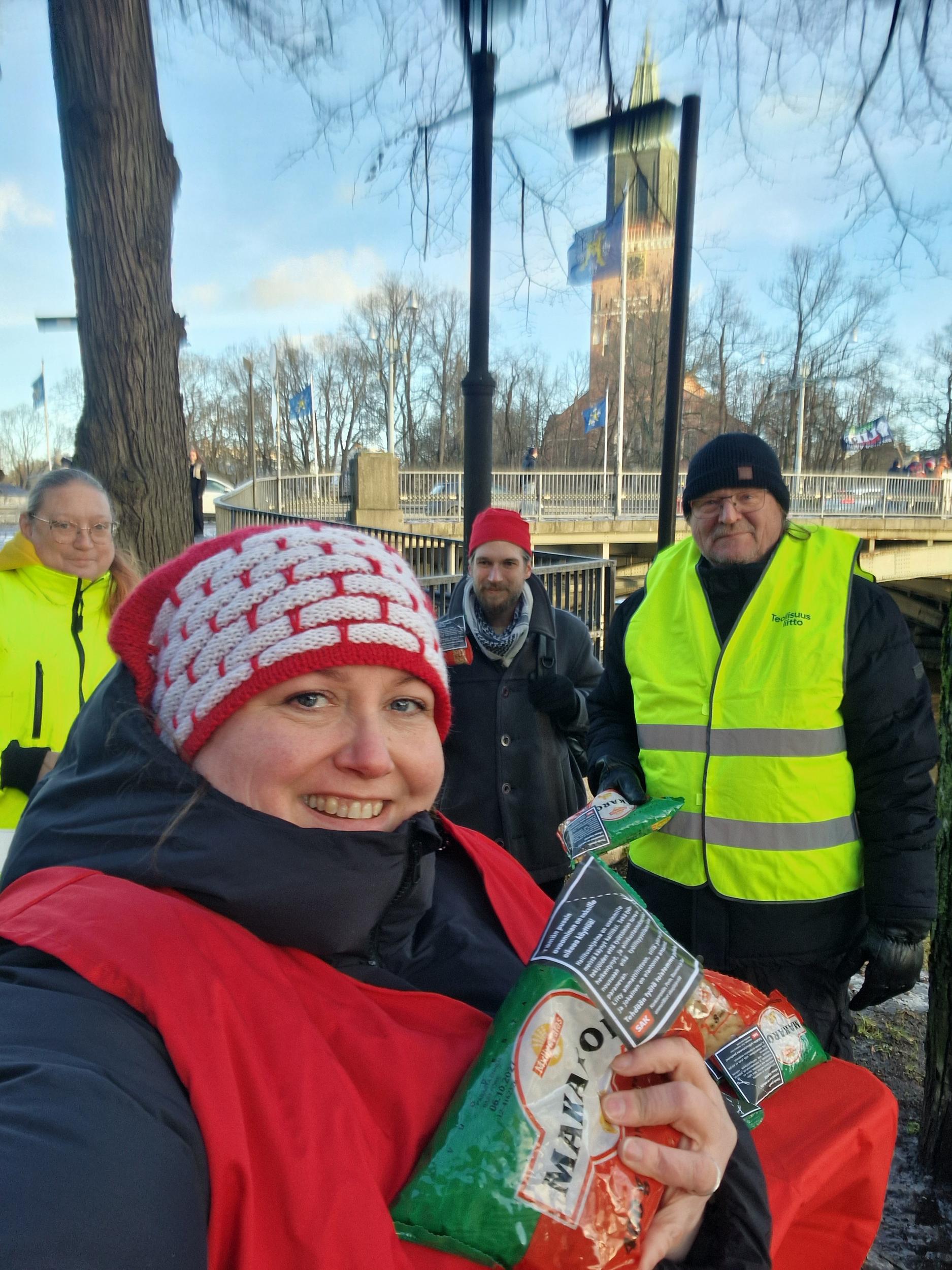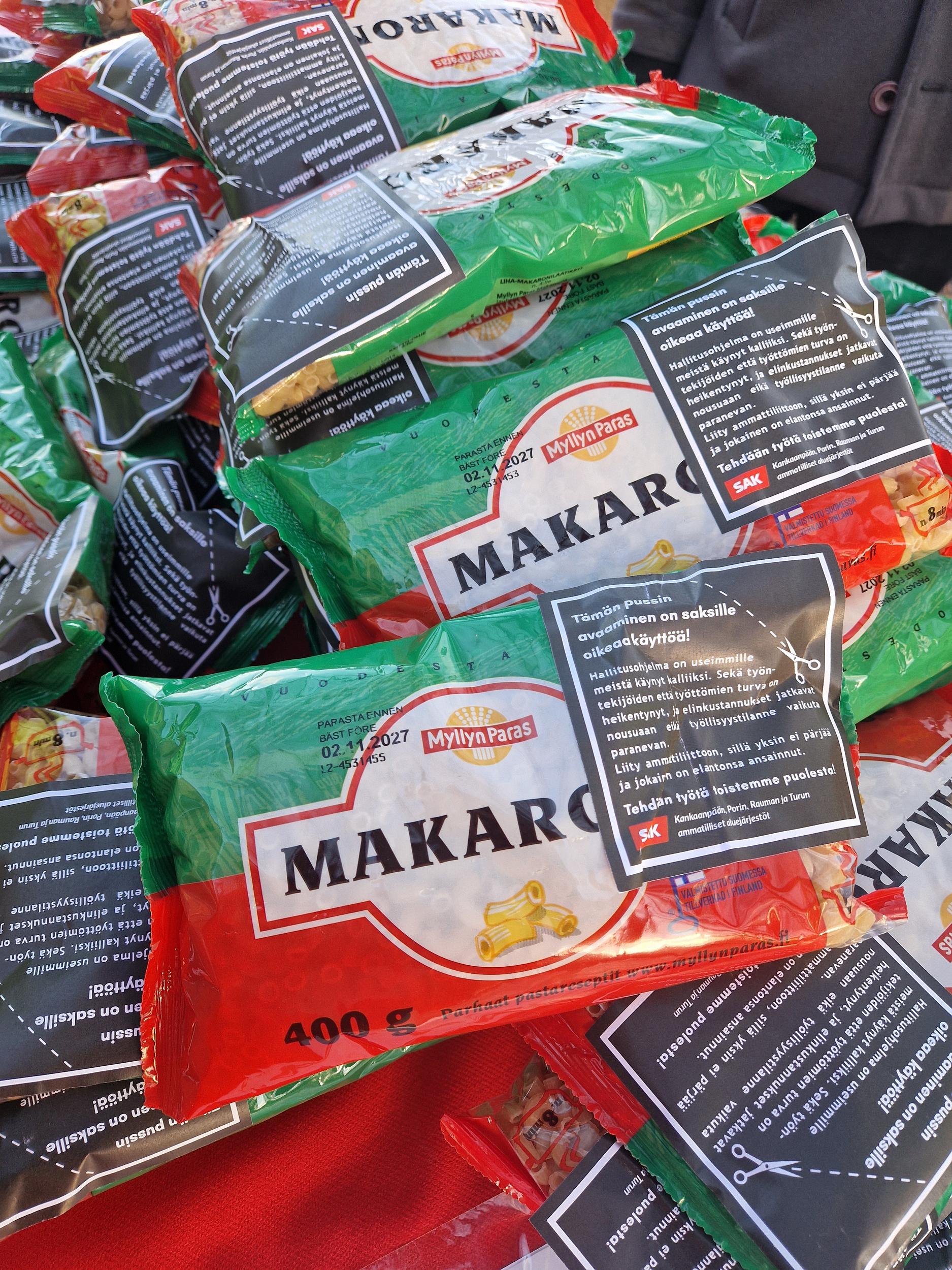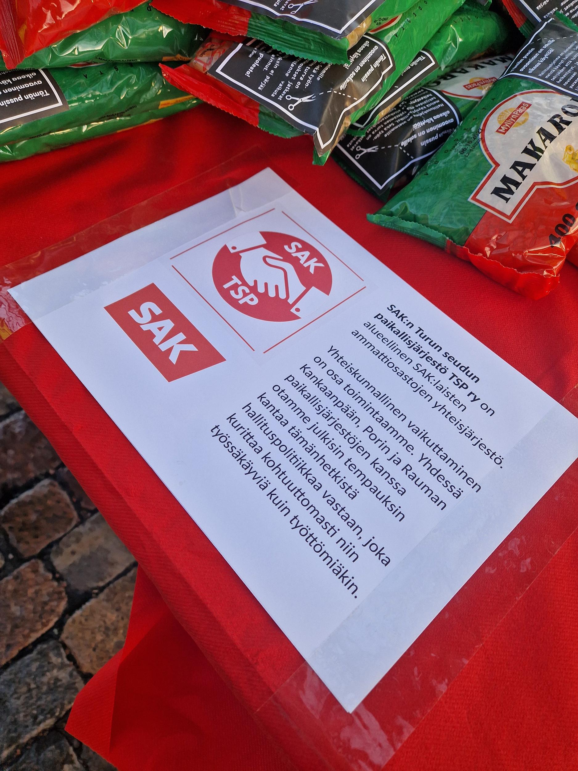 Turussa SAK Turun Seudun Paikallisjärjestö TSP oli Tuomiokirkkosillan kupeessa jakamassa makaronipusseja ja suuri määrä makaronia meni nopeasti tarvitsijoille. Kurjistamisen on loputtava!